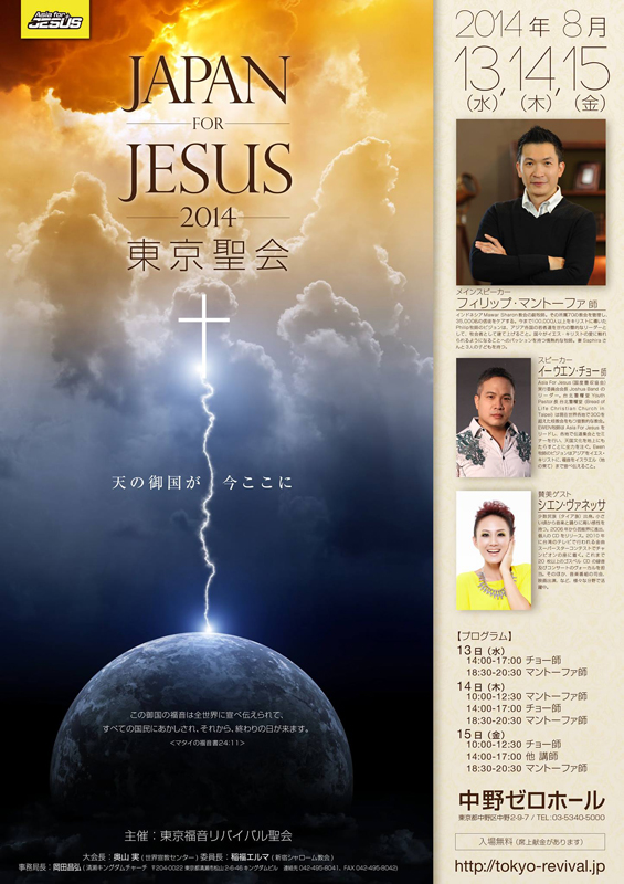 Japan for Jesus 2014 東京聖会(主催:東京福音リバイバル聖会)が、8月13日(水)~15日(金)に東京都中野区の中野ゼロホールで開かれる。入場無料(席上献金あり)。