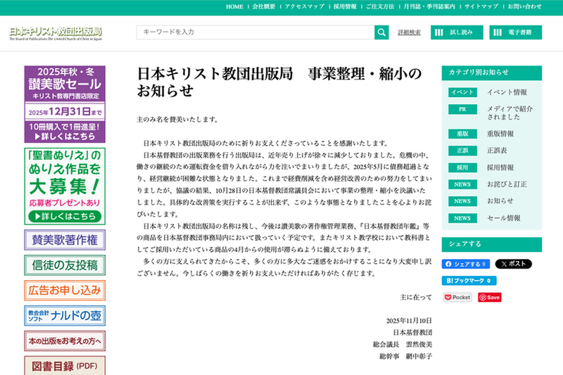 日本基督教団は10日、教団の出版業務を行う「日本キリスト教団出版局」の事業を整理・縮小すると発表した。10月28日開催の教団常議員会で決議した。近年売り上げが徐々に減少し、運転資金を借り入れながら経営改善を目指してきたが、5月には債務超過となり、経営継続が困難な状態になっていたという。