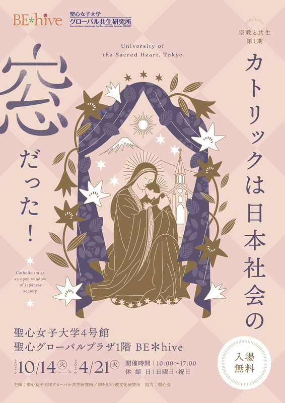 会場の同大聖心グローバルプラザ(東京都渋谷区広尾4-2-24)1階「BE*hive」では、大正から昭和初期にかけて活躍したカトリック神父・岩下壮一の司祭叙階100周年を記念する特別展「岩下壮一という多面体―20世紀のフランシスコ・ザビエル」の第2期「キリストに倣いて」(12月23日まで)や、常設展「武器をアートに」も開催されている。詳細はホームページを。