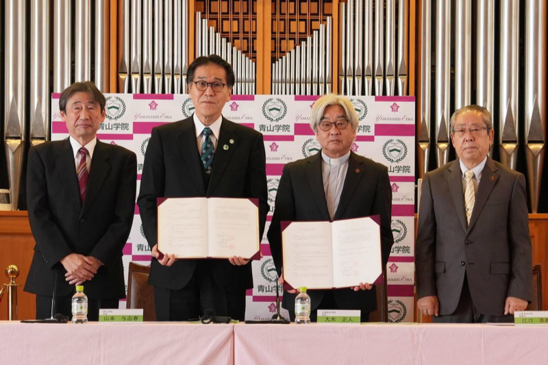 学校法人青山学院(東京都渋谷区)と学校法人山梨英和学院(甲府市)は24日、教育提携に関する協定を締結した。共にメソジスト系の学校法人で、協定は共通のミッションであるキリスト教教育の一層の充実と発展、中等教育と高等教育の連携強化を図ることを目的としている。