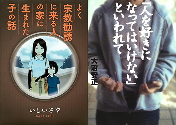 いしいさや著『よく宗教勧誘に来る人の家に生まれた子の話』(講談社)は、エホバの証人の母親のもとで育てられた半生を描いた漫画。大沼安正著『「人を好きになってはいけない」と言われて』(講談社)も、統一協会の両親に育てられた著者の自叙伝だ。