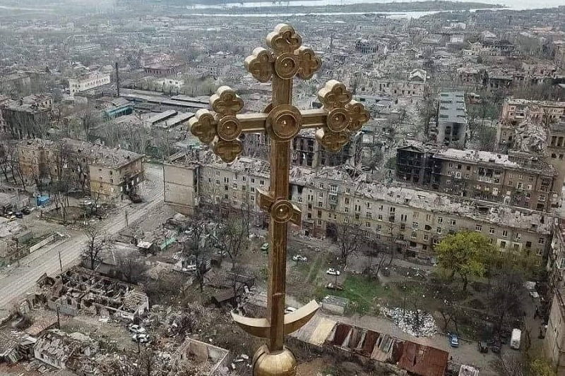 ロシア軍に包囲され、徹底的に破壊されたウクライナのマリウポリを、上空から撮影した写真を見た。教会の十字架を前にして、背景には、砲弾の雨を浴びて廃墟のように崩れたマリウポリの街が写っていた。