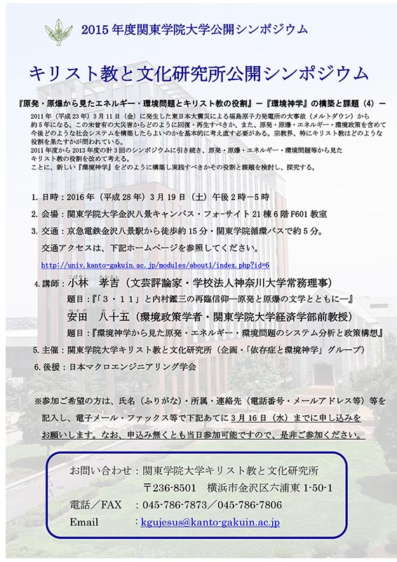 神奈川県:関東学院大学公開シンポ「原発・原爆から見たエネルギー・環境問題とキリスト教の役割」